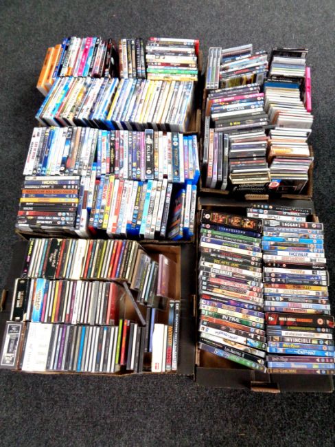 Five boxes containing a large quantity of DVDs