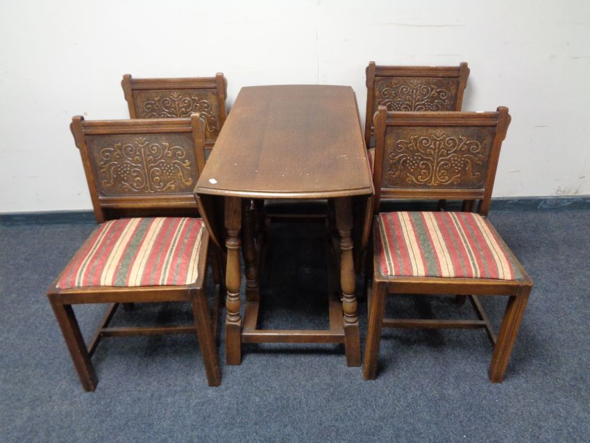 An oak gate leg table and set of four oak dining chairs with carved panel backs in striped upholstery