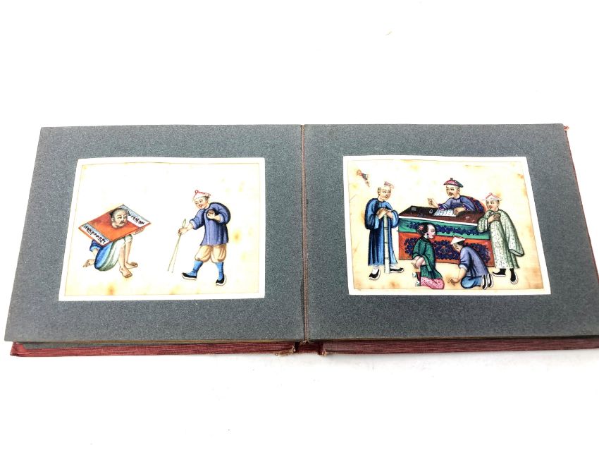 A photograph album containing a quantity of 19th century Chinese gouche paintings on pith, some depicting scenes of torture (10), as well as a small quantity of monochrome photographs.