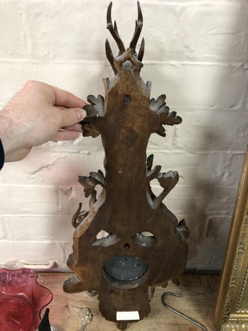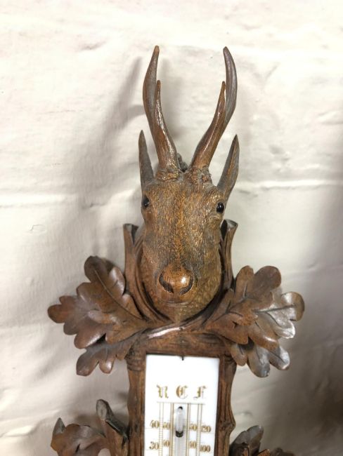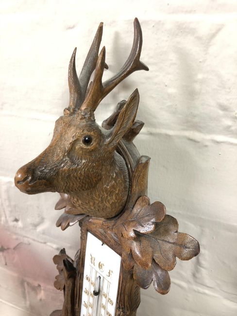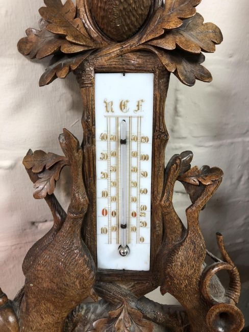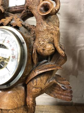 A late 19th century Black Forest carved oak hunting-themed barometer