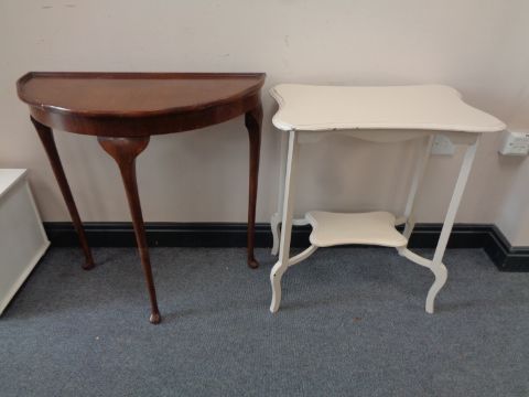 A walnut demi lune console table and a painted occasional table