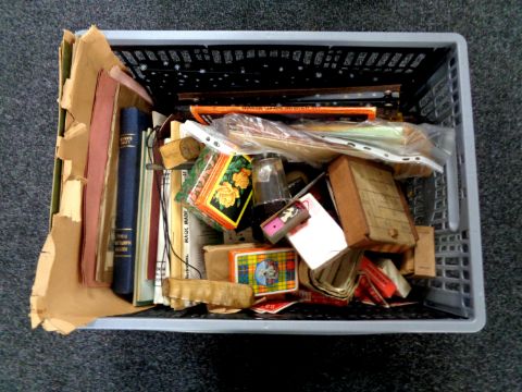 A crate containing a collection of playing cards, books relating to magic, magic tricks etc
