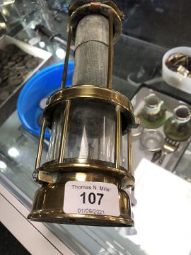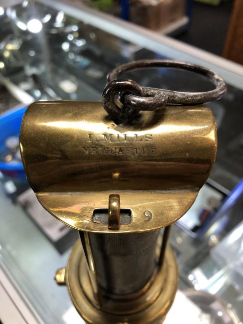 A scarce I. Mills, Newcastle davy brass miner's lamp, flip top stamped '9', height 32cm including hoop.