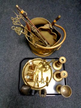 A tray containing two pairs of brass candlesticks, pair of brass model canons, brass tray together with a Victorian brass coal receiver containing toasting forks, key rack in the form of a key etc