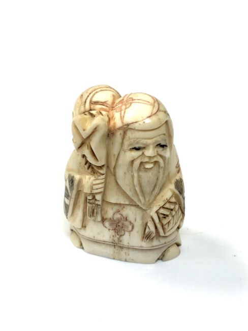 A carved Chinese bone netsuke - Elderly gentleman holding a sack on shoulder