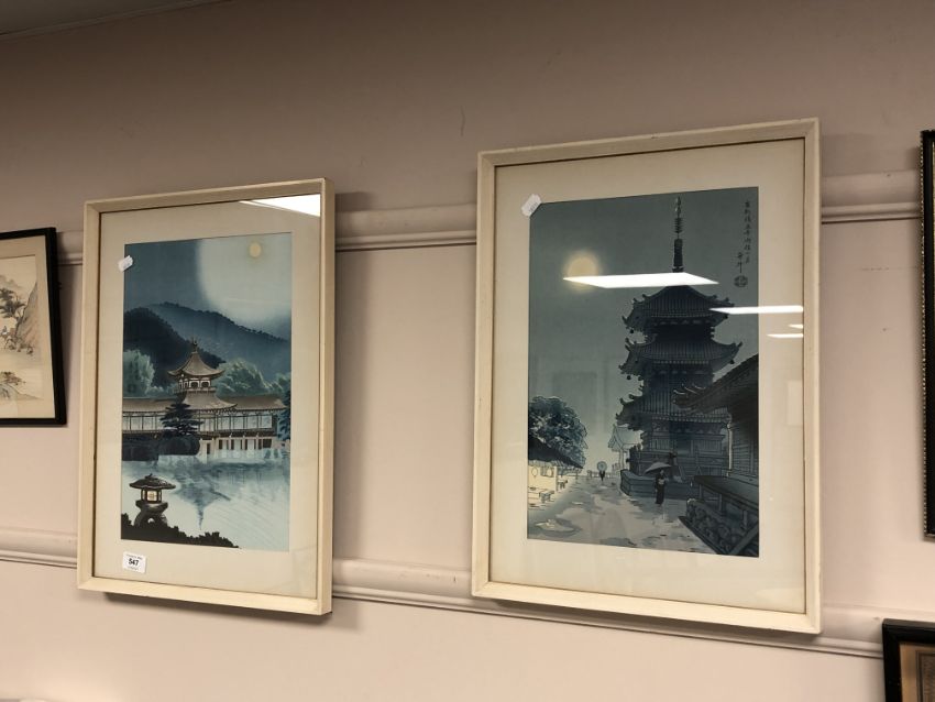 Two 20th century Japanese colour prints depicting palaces, 38 x 51 cm (2)
