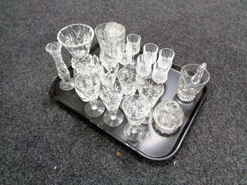 A tray containing a quantity of 20th century cut glassware, Edinburgh crystal vase, hand bell etc