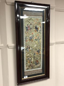 A 20th century Japanese embroidered panel depicting figures riding animals, 38 x 82 cm