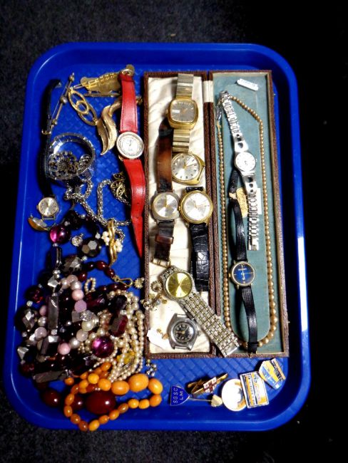 A tray of a collection of costume jewellery to include beaded necklaces, brooches, simulated pearls, enamel transport badges etc together with lady's and gent's wristwatches to include Sekonda, Rotary, etc