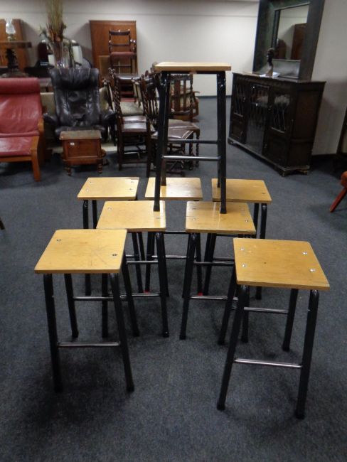 A set of eight 20th century plywood topped science lab stools on metal legs