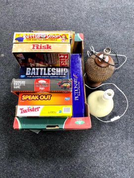 A box containing assorted board games to include Battleship, Risk, together with 20th century Eagle comics and two table lamps