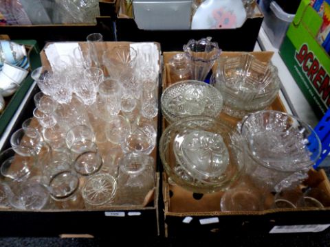 Two boxes of a large quantity of assorted glass ware to include drinking glasses, pressed glass fruit bowls, decanter etc
