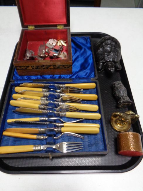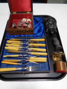 A tray containing cased fish cutlery, coal figures, brass figure of an eagle, pocket knife, brooches etc