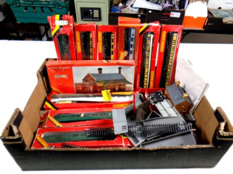 A box containing boxed Hornby railways rolling stock, boxed and unboxed buildings