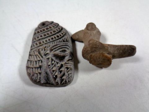 A carved stone pendant, face of a man, together with a miniature antique pottery figure of a bird