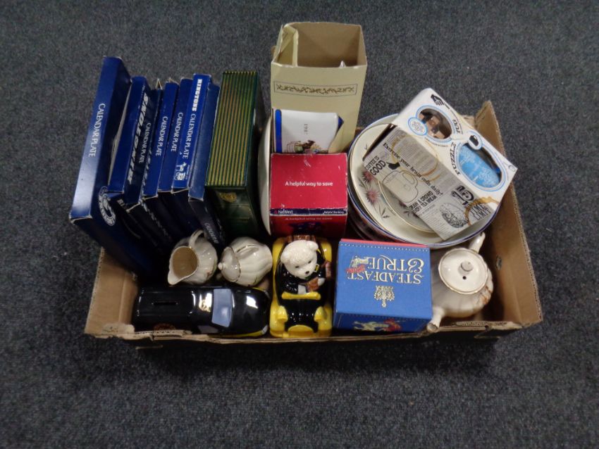 A box of miscellany to include Ringtons calendar plates and novelty teapots, Johnson Brothers bowl, boxed commemorative mug etc
