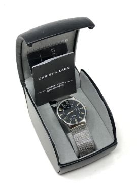 A gent's stainless steel Christin Lars calendar wristwatch, boxed.