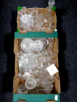 Two boxes containing a large quantity of assorted glassware to include decanter with stopper, drinking glasses