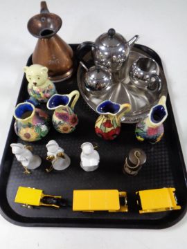 A tray containing antique copper half pint jug, miniature brass oil lamp, Ringtons die cast vehicles, five pieces of Old Tupton china etc