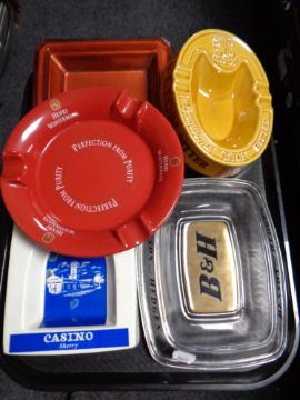 A tray of five vintage glass and ceramic ash trays : Lion Bitter, Benson & Hedges, Henry Wintermans etc