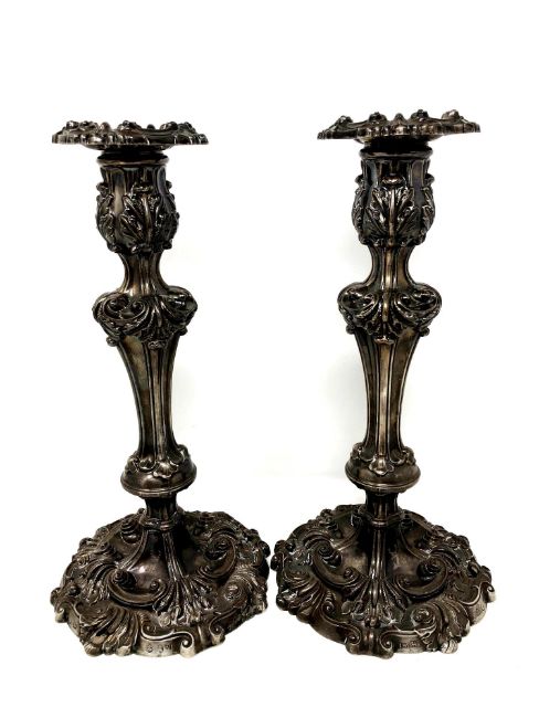 A large pair of George IV ornate silver candlesticks with sconces, John Watson, Sheffield 1821, height 28cm