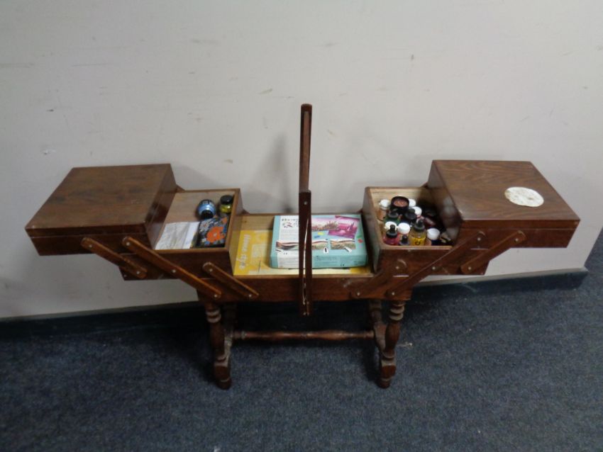 A quantity of miscellany to include folding camping chairs, character jugs, candles, plastic parasol base, concertina sewing box with contents, Kilner drinks dispenser etc
