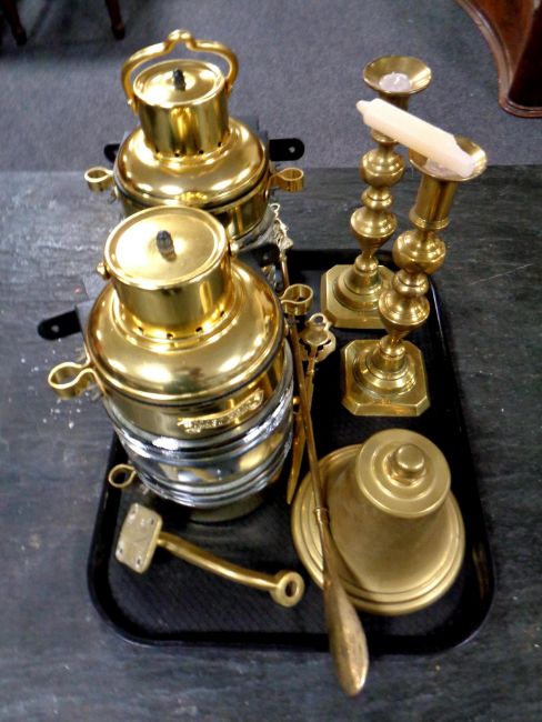 A box containing antique and later brass ware to include candlesticks, shoehorn, letter opener, a reproduction Titanic ship's bell, together with two contemporary ship's masthead lamps