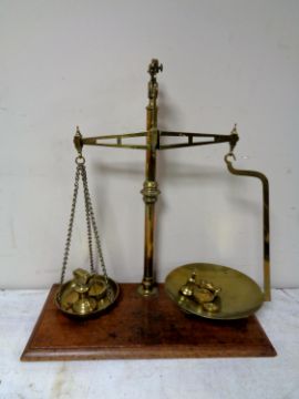 A set of antique brass pan scales with weights mounted on a board