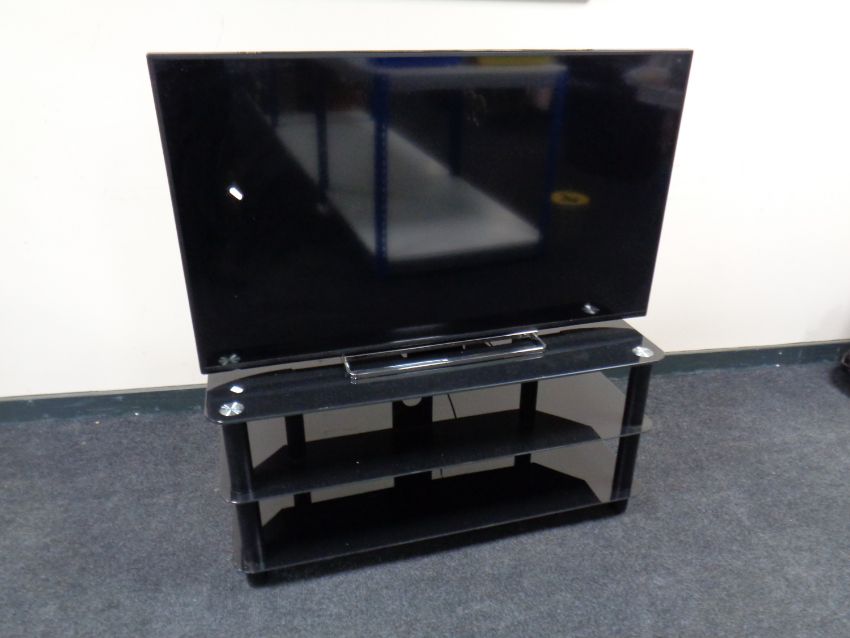 A Toshiba 49'' LCD TV with remote on black glass stand