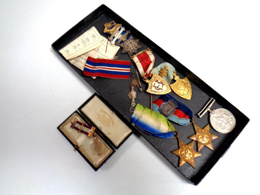 A box containing a quantity of World War II medals and Freemason's medals to include one with 9ct gold mounts