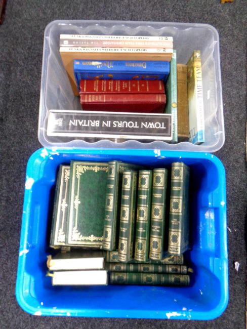 A suitcase Itek record player together with two boxes of books to include Reader's Digest novels, encyclopedia's etc