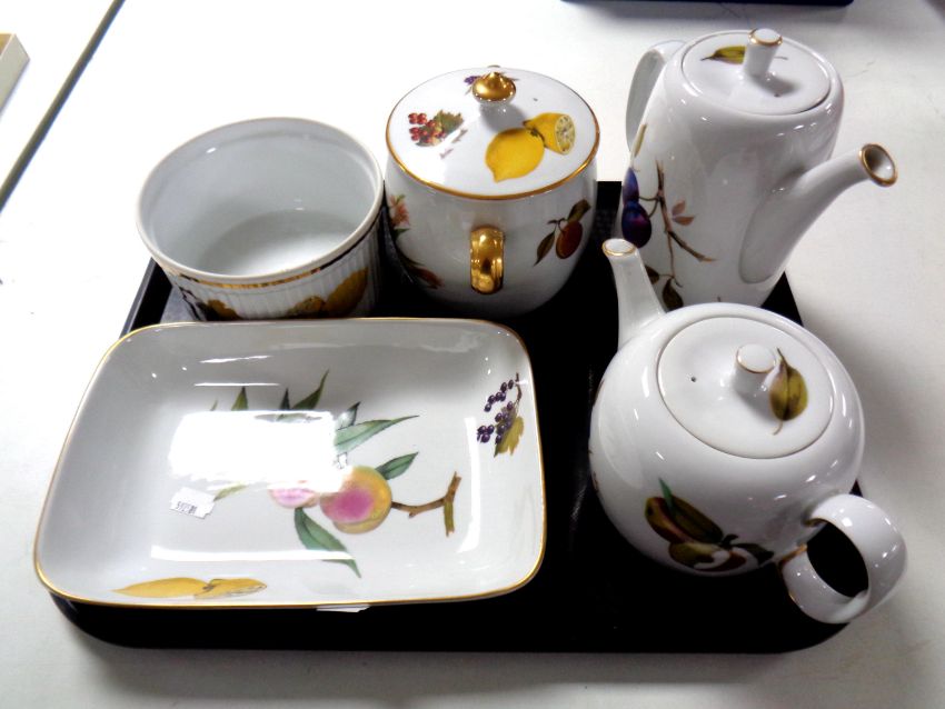 A tray containing five pieces of Royal Worcester Evesham to include tea and coffee pots and dishes