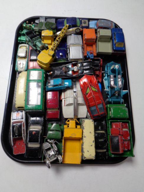 A tray containing a quantity of mid 20th century and later die cast vehicles to include Dinky Toys Jaws car, Corgi Toys Batmobile etc