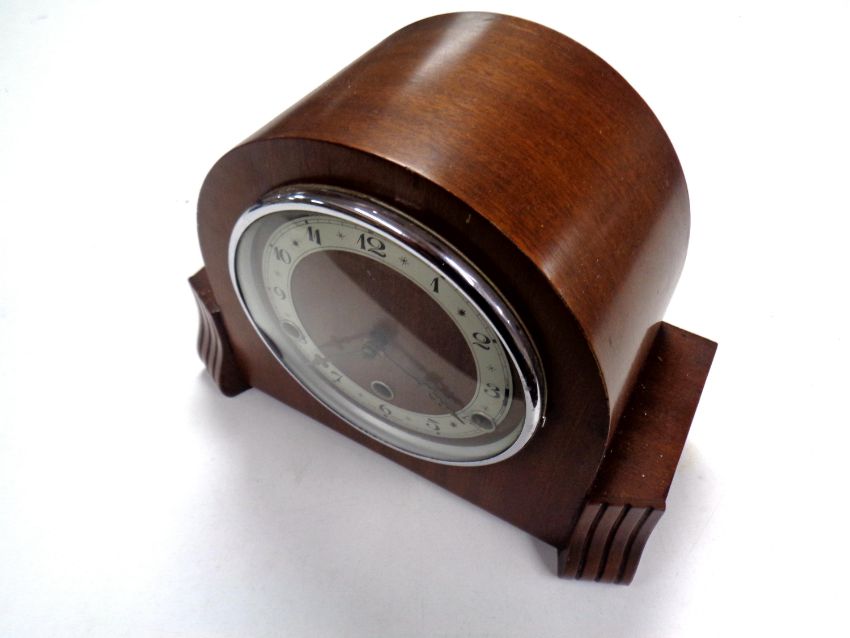 An early 20th century mahogany cased eight day mantel clock with silvered dial