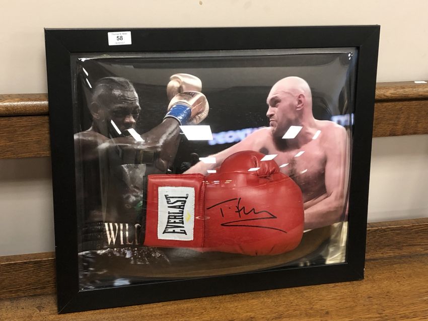 A sporting memorabilia montage : A signed red Everlast boxing glove, Tyson Fury, with certificate of authenticity from Montage Moments, 50.5 x 61 cm