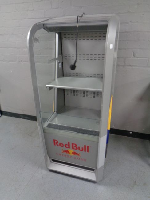 A shop display fridge bearing Red Bull advertising
