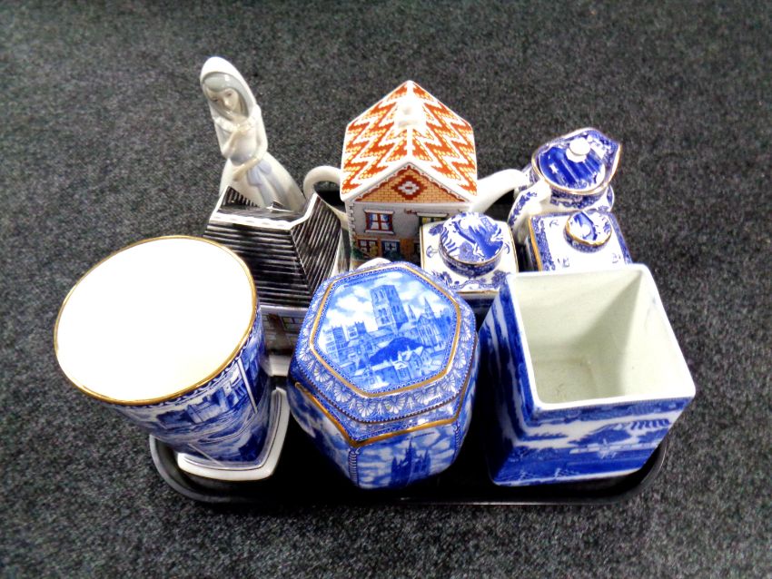 A tray containing Ringtons china to include teapots, caddies, vases, together with a Spanish figure