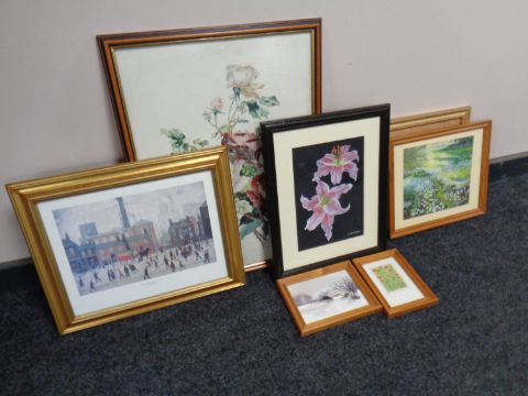 A box containing assorted pictures and prints including an L. S. Lowry print, 'Coming Home from the Mill', a K. Burden painting, flowers, etc