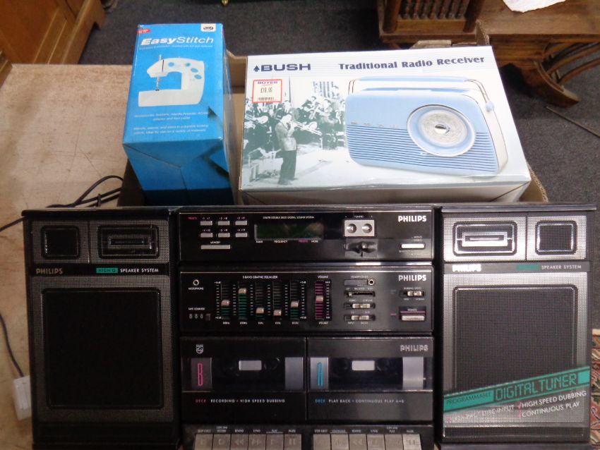A Phillips hifi system together with a Bush retro radio, a JML easy stitch sewing machine and a big button remote control