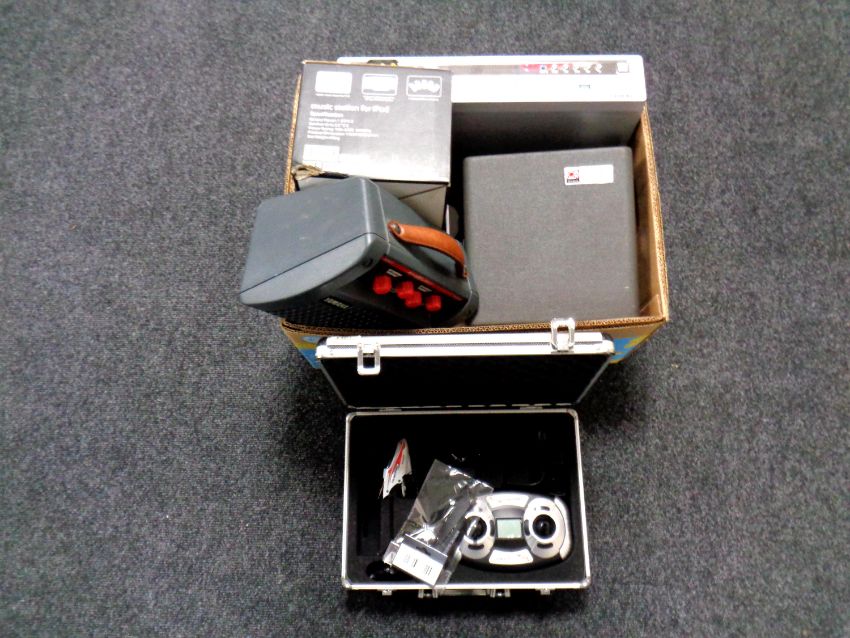 A box containing Samsung DVD VCR recorder, cased Kodak projector, a Yamaha guitar amplifier, together with a boxed iPod station and a remote control helicopter