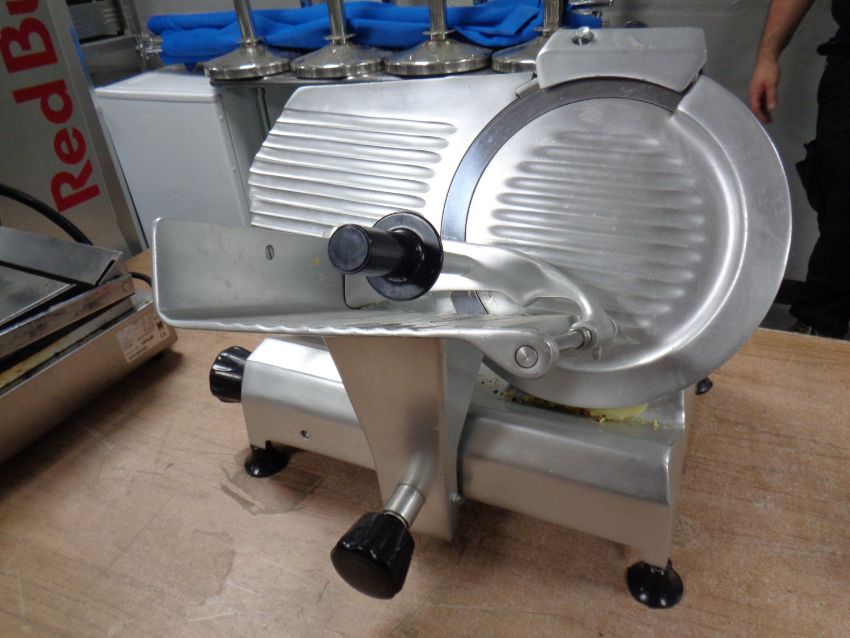 A stainless steel meat slicer