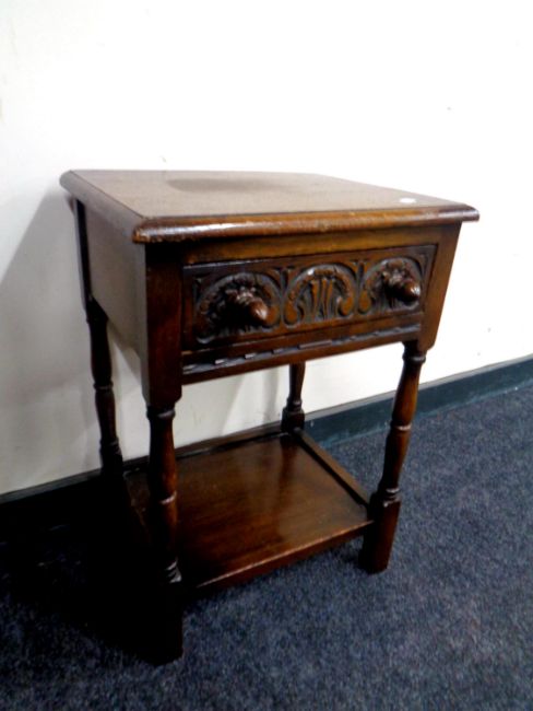 An oak side table fitted a drawer
