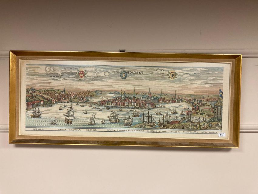 A needlework panel depicting Stockholm, 115 x 41 cm, framed