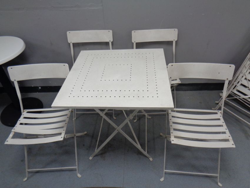 A folding metal square cafe table and four chairs