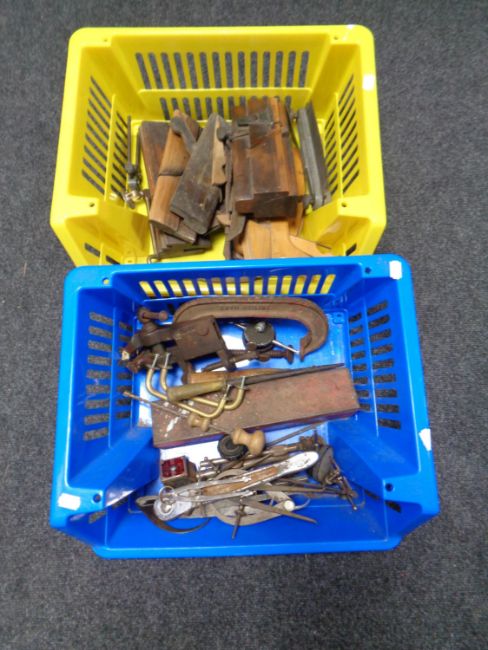 Two plastic baskets containing vintage woodworking planes, clamps, precision tools etc