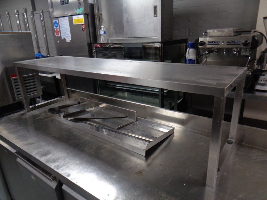 A stainless steel counter top shelf, width 156 cm and two further stainless steel shelves one with wall brackets