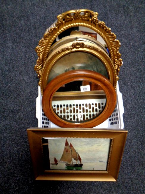 A basket containing a gilt framed oil on board, boats on open water, a gilt dressing table mirror together with a mahogany circular porthole mirror and a further gilt framed black and white print