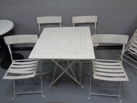 A folding metal square cafe table and four chairs