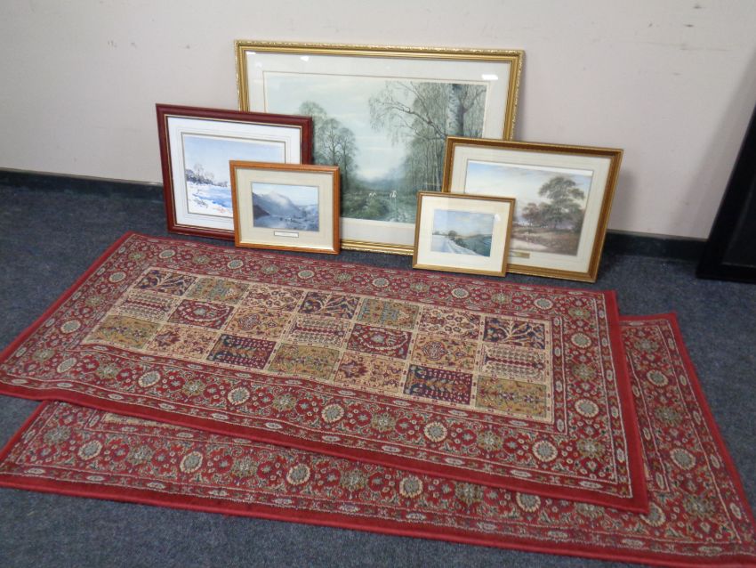 A pair of Ikea Persian patterned runners together with five framed pictures