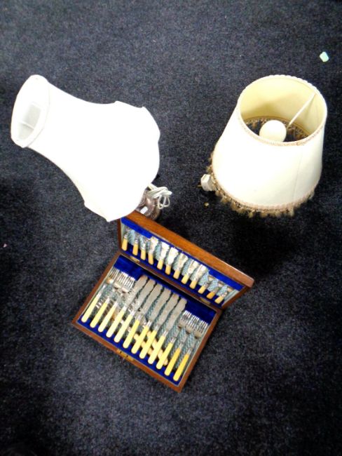 A pair of silver plated candlesticks converted to table lamps together with an Edwardian oak canteen containing plated fish cutlery